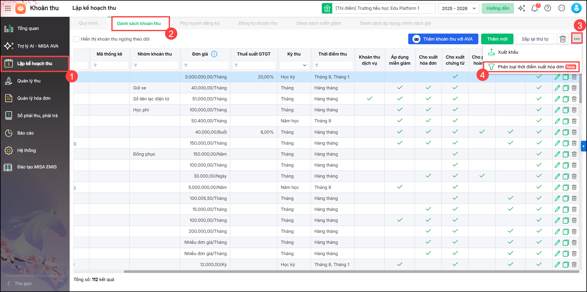 - Vào Lập kế hoạch thu/Danh sách khoản thu. Nhấn biểu tượng dấu (…) chọn Phân loại thời điểm xuất hóa đơn