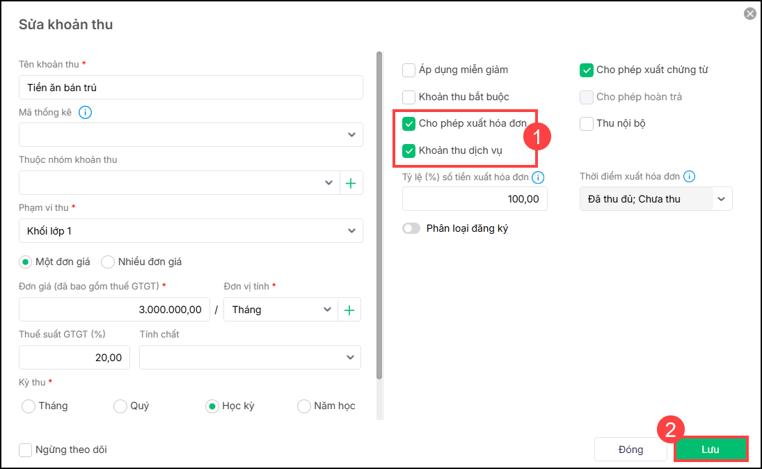 2. Tại màn hình sửa khoản thu, anh/chị tích chọn tại ô Cho phép xuất hóa đơn và Khoản thu dịch vụ với những tiền học phí, tiền ăn bán trú…Sau đó nhấn Lưu.