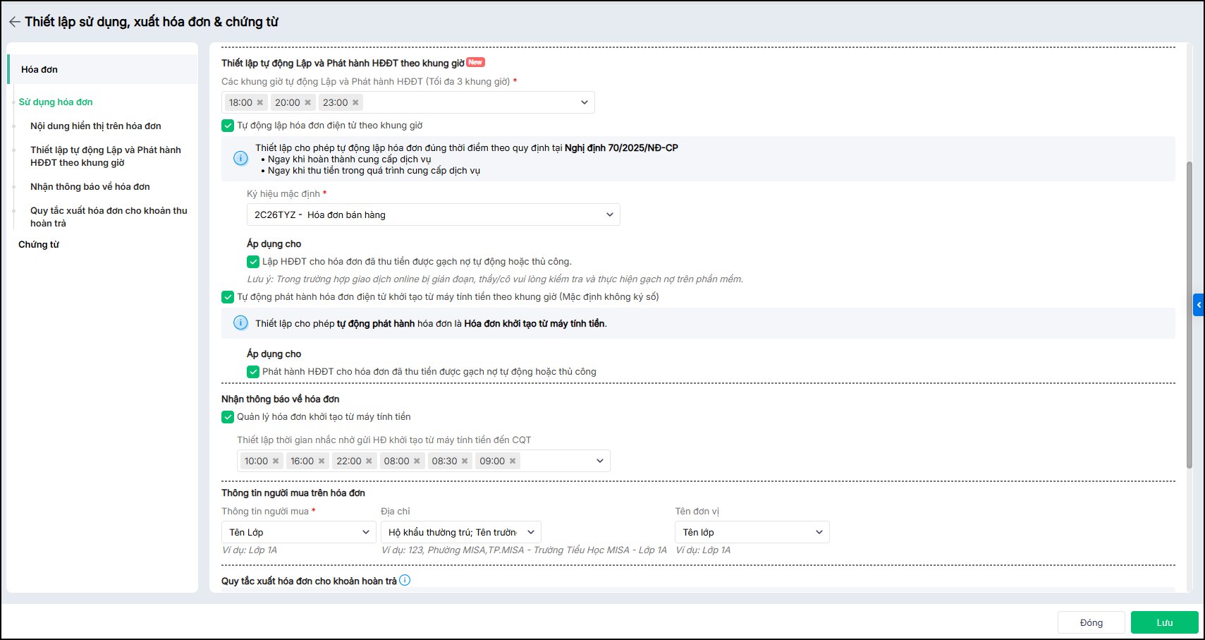 | Tự động lập hóa đơn điện tử theo khung giờ | – Nếu tích chọn => Tự động tích chọn tại các thiết lập Ký hiệu mặc định; Lập HĐĐT cho khoản thu chưa thu tiền; Lập HĐĐT cho khoản thu đã thu tiền |