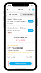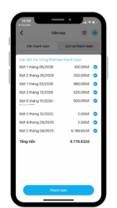 - Chọn đợt thu học phí cần thanh toán cho con, nhấn Thanh toán