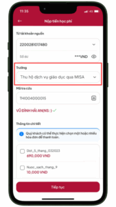 Ứng dụng sẽ tự động lấy lên thông tin của con và các đợt thu cần đóng. Anh/chị tích chọn đợt thu muốn thanh toán và chọn Tiếp tục.