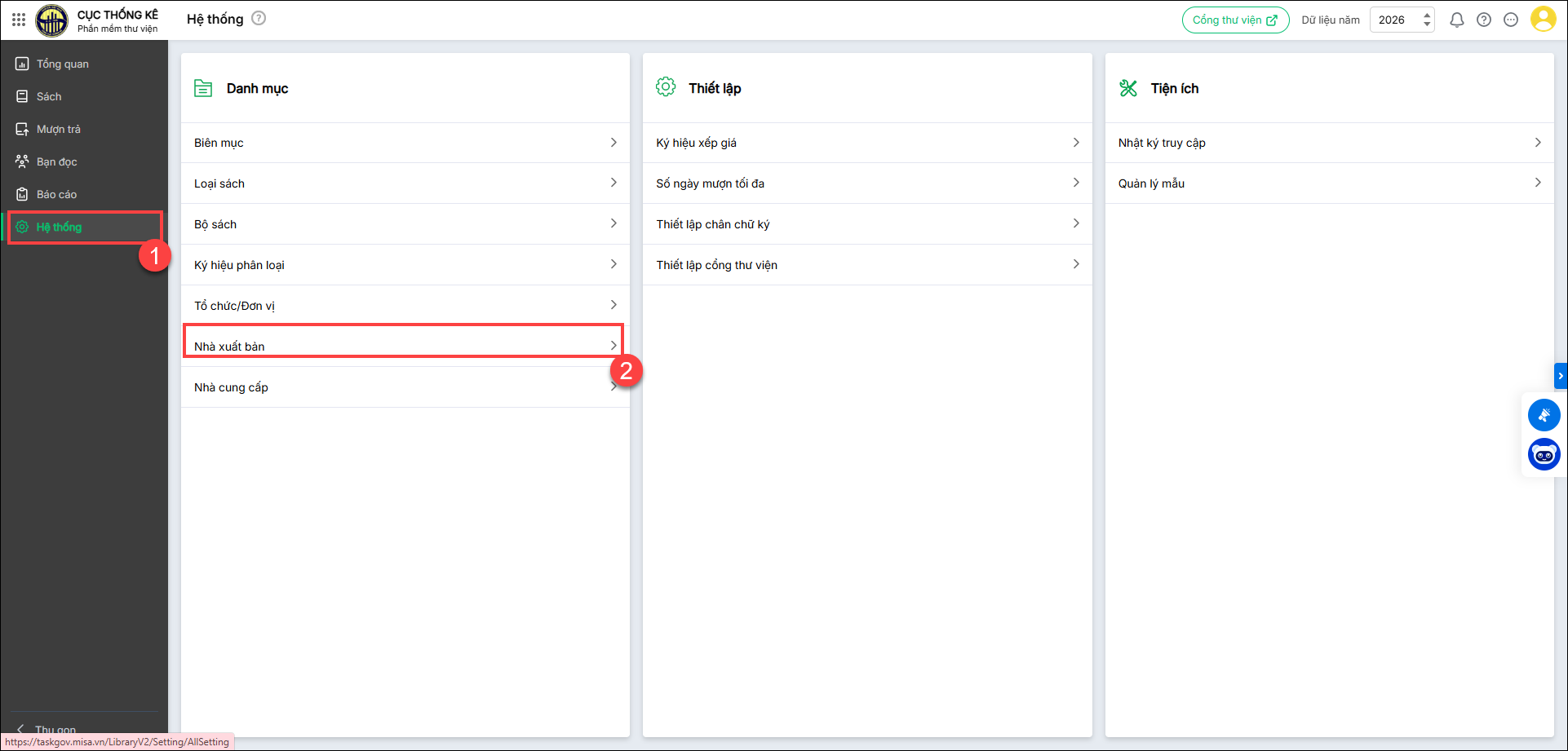 Hỗ trợ CBTV quản lý danh sách Nhà xuất bản (NXB) để thực hiện biên mục sách và dễ dàng thống kê trên báo cáo.
