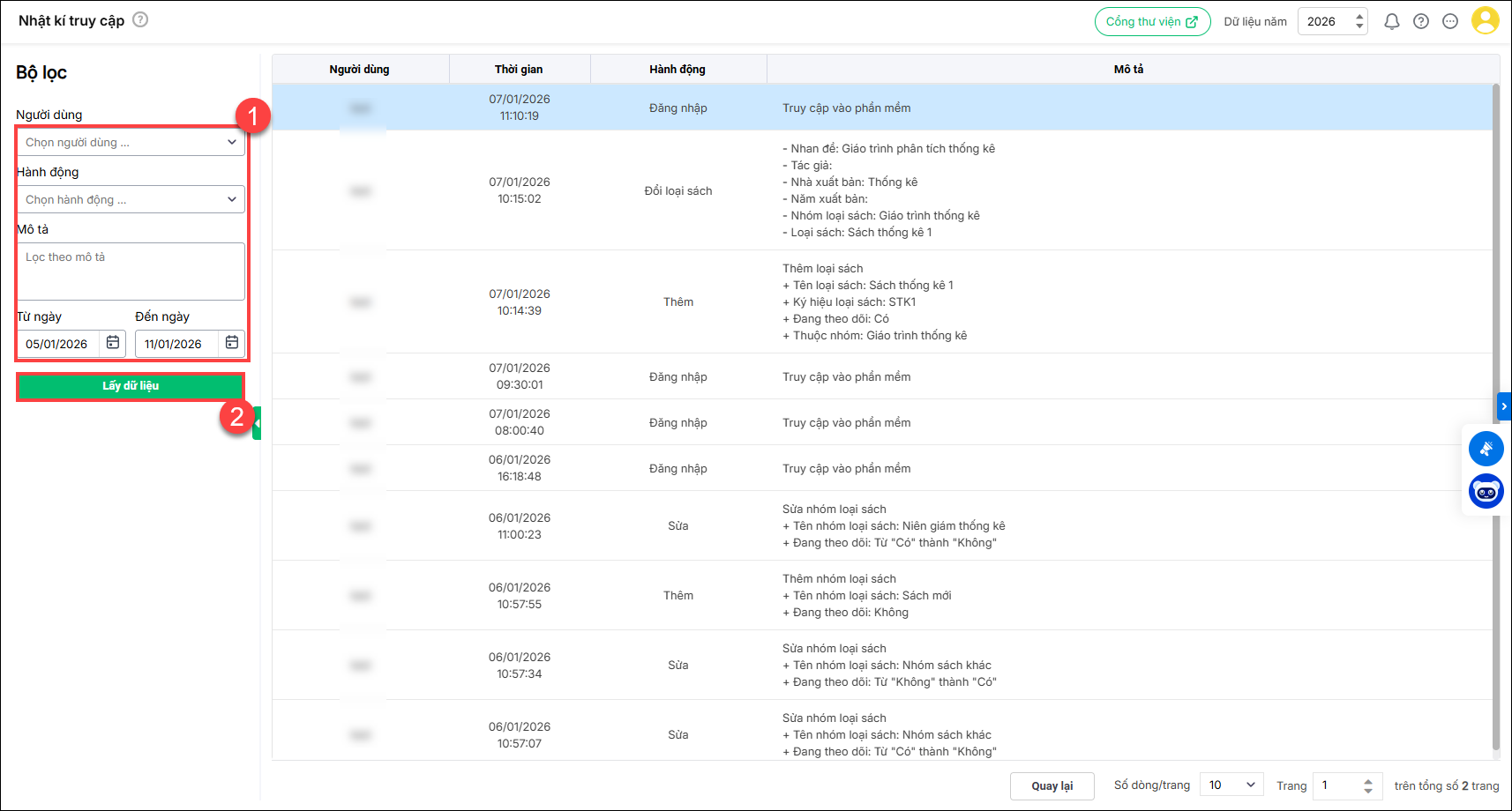 Phần mềm hỗ trợ cán bộ thư viện có thể theo dõi được các thao tác thêm/sửa/xóa đã thực hiện trên phần mềm theo từng người dùng.