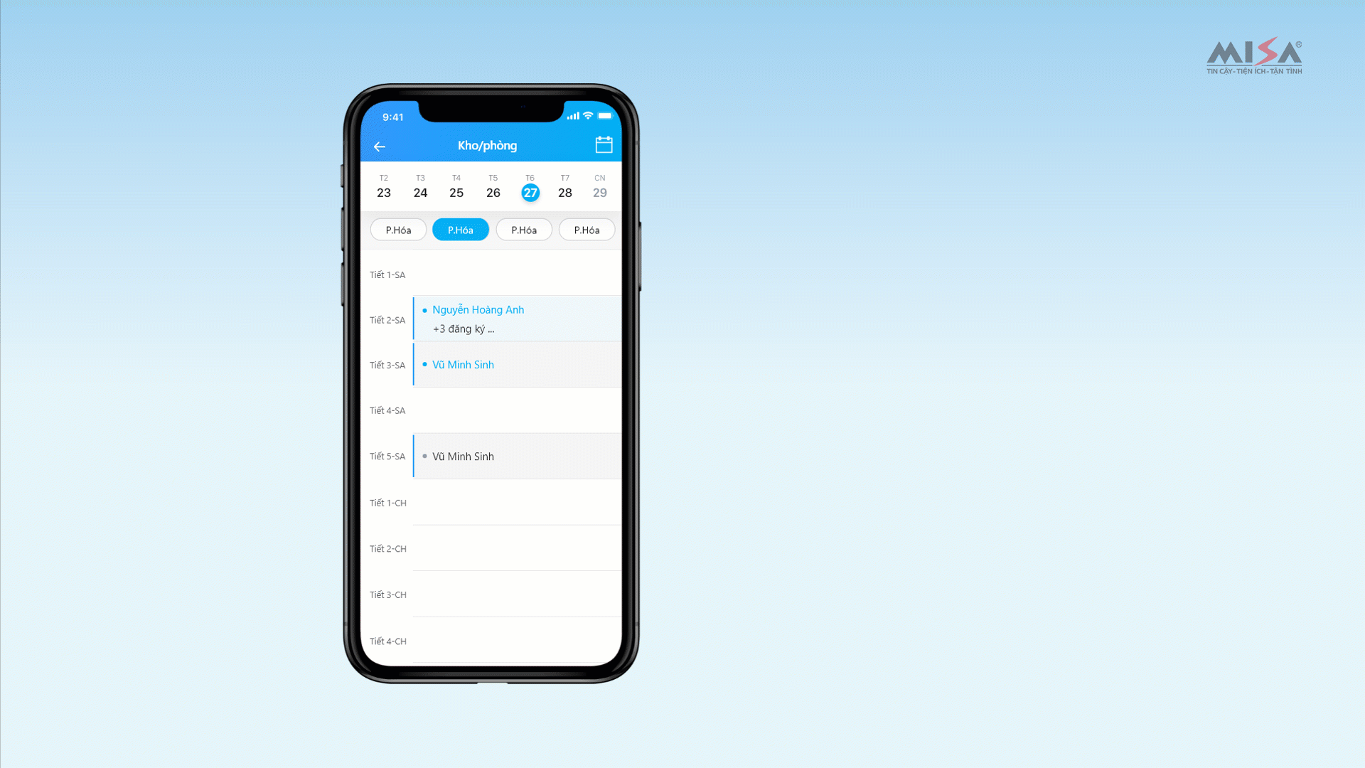 - Chọn kho phòng đã đăng ký mượn. Chạm vào tiết đã đăng ký mượn kho phòng