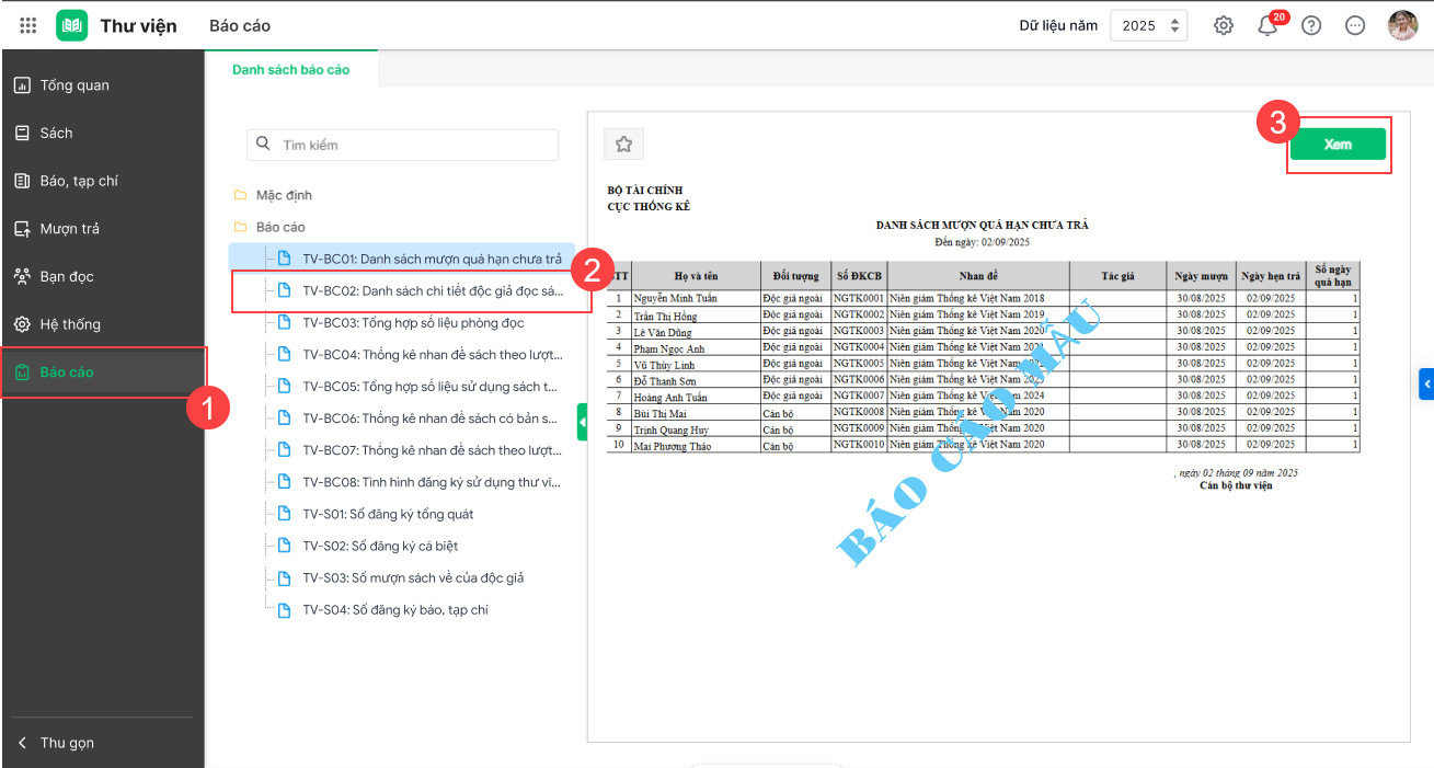 - Chọn Thư viện\Báo cáo\TV-BC02: Danh sách chi tiết độc giả đọc tại chỗ. Nhấp đúp chuột vào tên báo cáo hoặc nhấn Xem