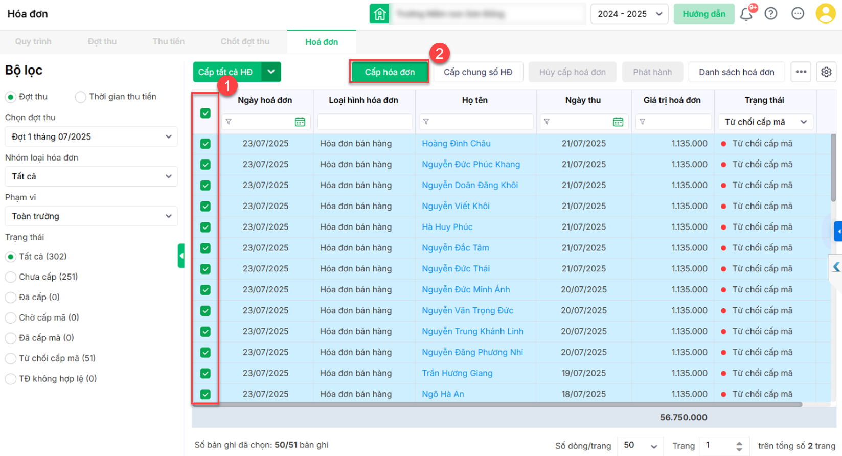 3. Tích chọn vào hóa đơn CQT từ chối cấp mã, nhấn Cấp hóa đơn (thực hiện tương tự như khi bạn cấp hóa đơn mới, xem hướng dẫn chi tiết tại đây)
