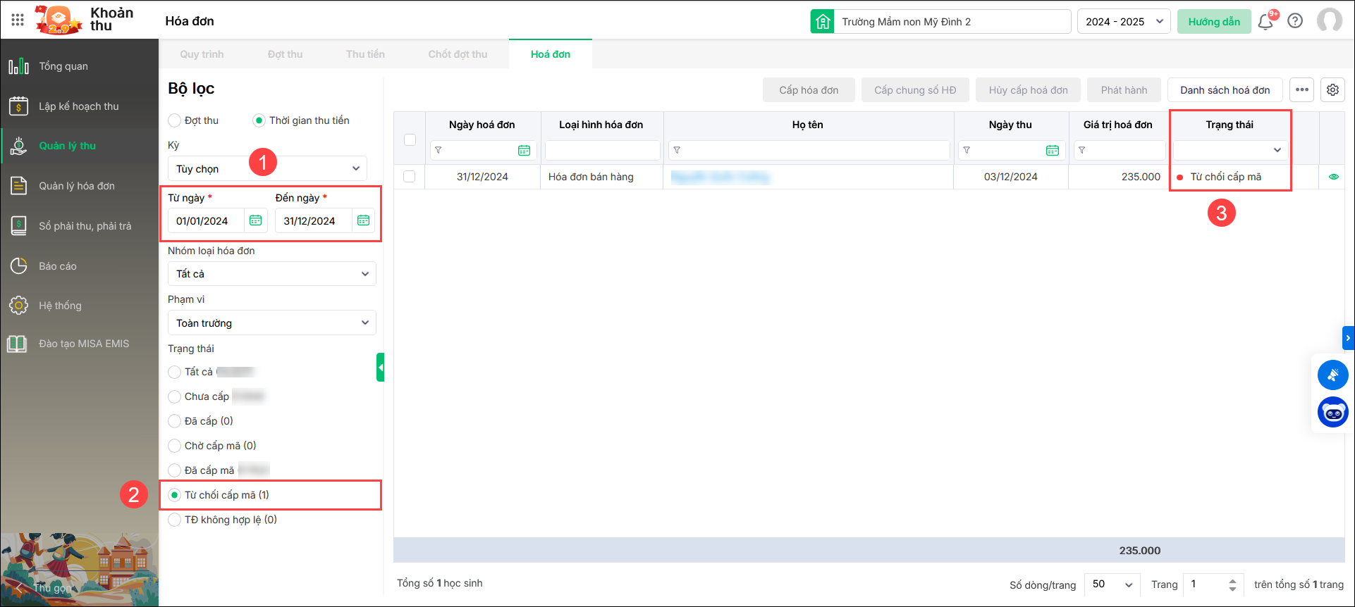 1. Bạn vào Quản lý thu/Hóa đơn. Với những hóa đơn đã phát hành bị CQT từ chối cấp mã có trạng thái Đã cấp – Từ chối cấp mã