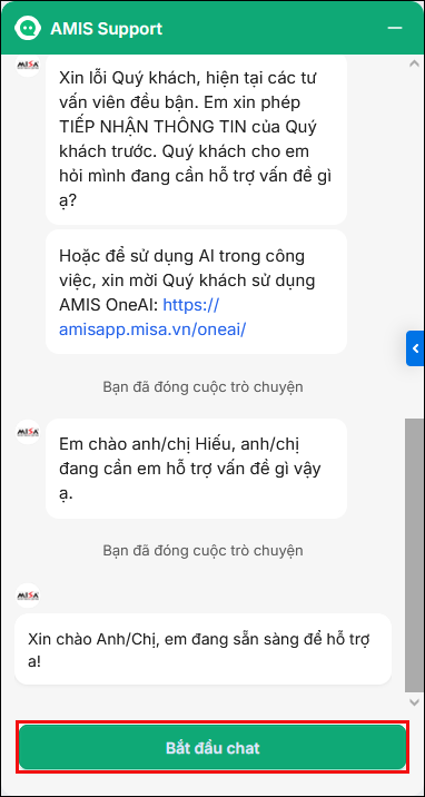 Bước 2: Phần mềm xuất hiện hộp thoại chat AMIS Support, Chọn Bắt đầu chat để chat với Trợ lý số MISA AVA.
