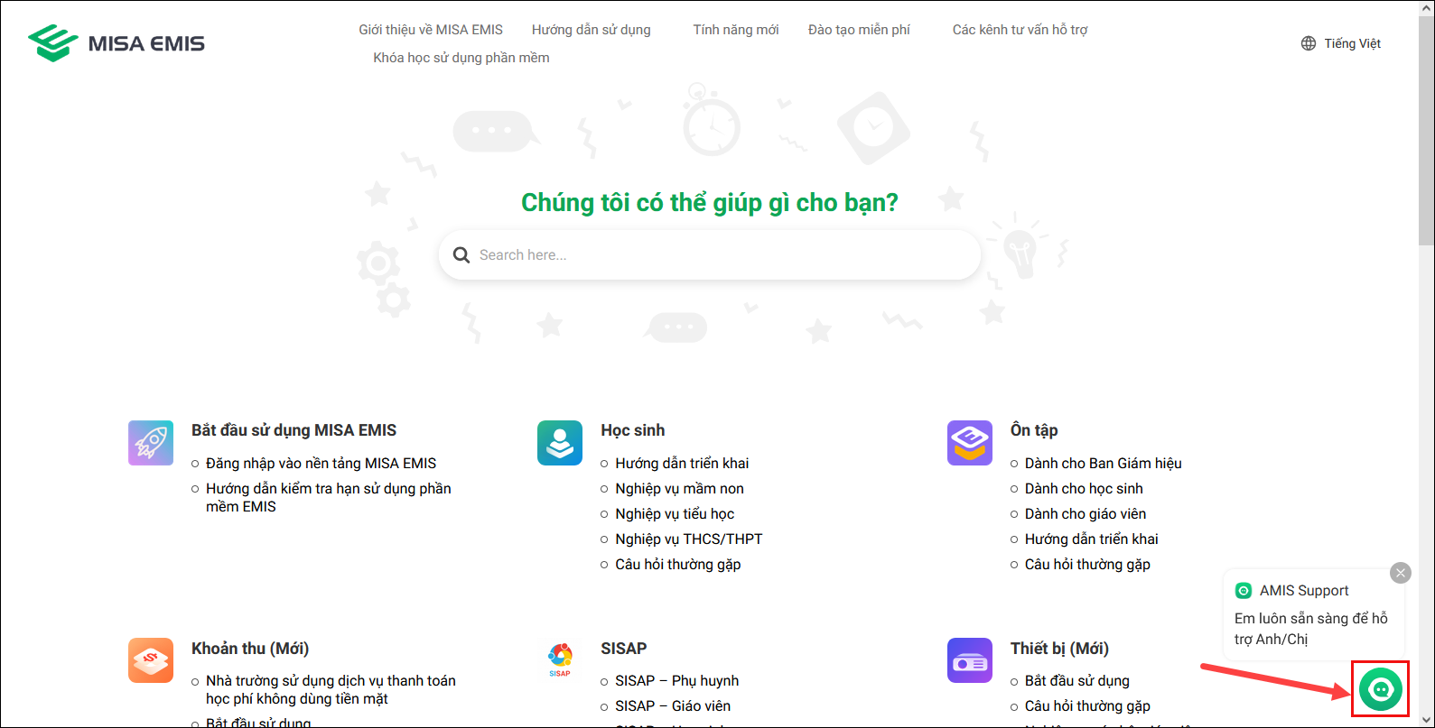 Bước 1: Tại màn hình https://emishelp.misa.vn/, anh/chị chọn vào biểu tượng 💬 AMIS Support