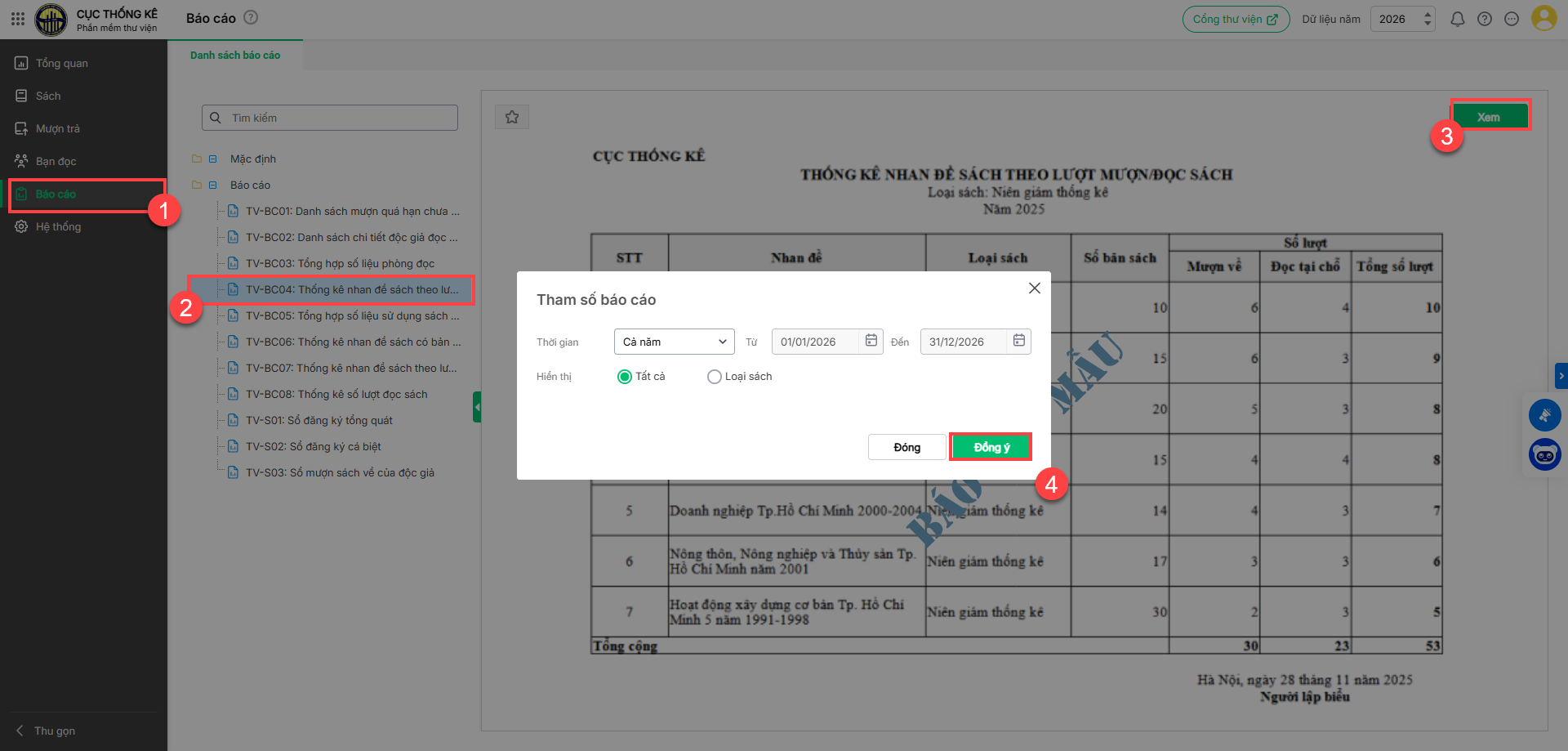 - Vào Báo cáo, nhấn đúp chuột tại báo cáo TV-BC04: Thống kê nhan đề sách theo lượt mượn/đọc sách. Hoặc chọn báo cáo trong danh sách, nhấn Xem.