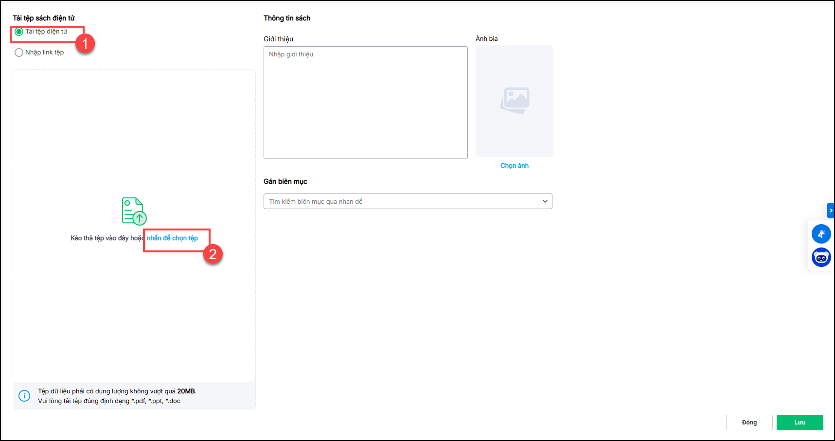 1.1. Nhấn Tải lên tệp sách điện tử.