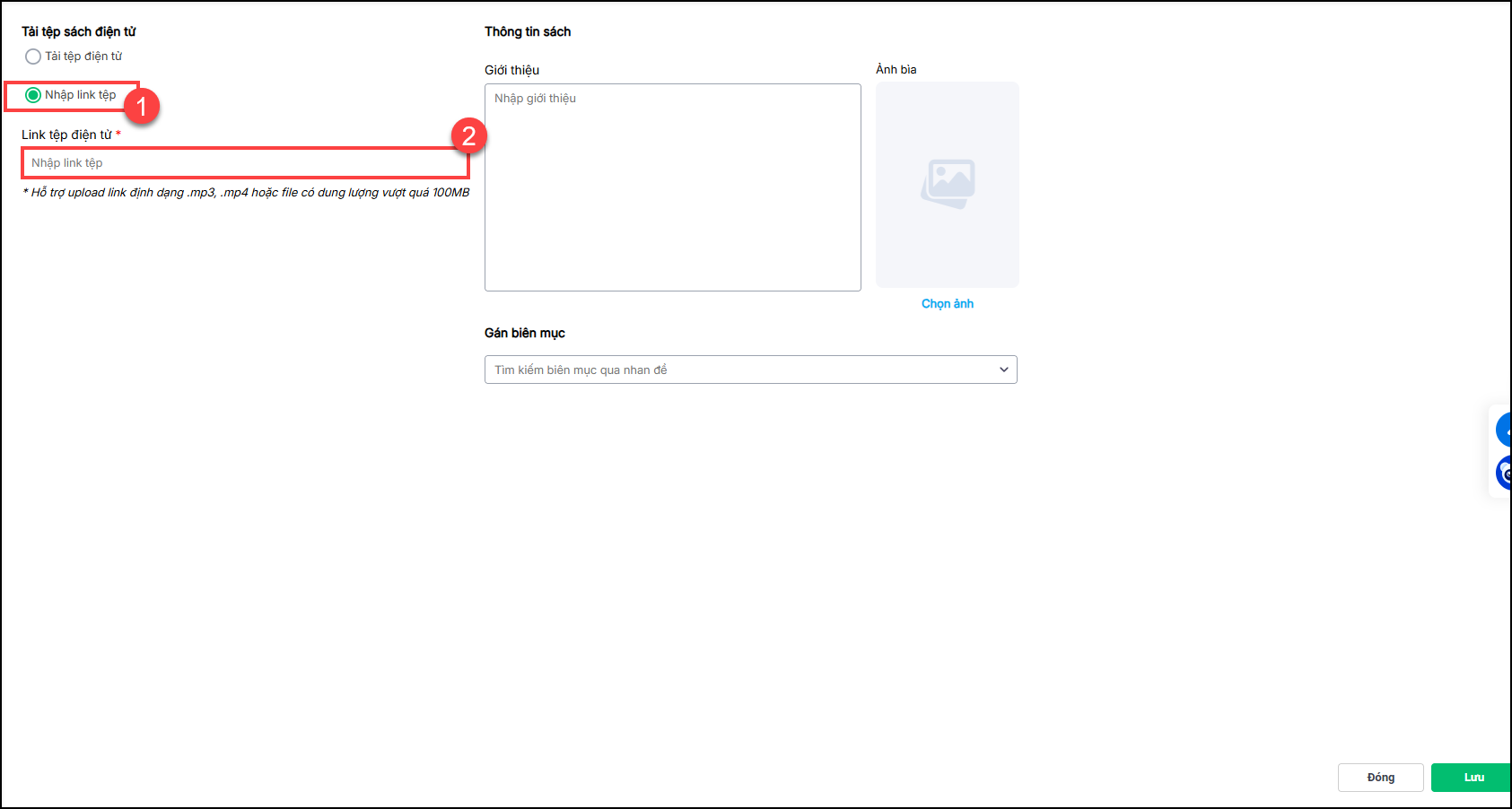 - Nhập link tệp: Anh/chị thực hiện upload link định dạng mp3 hoặc mp4