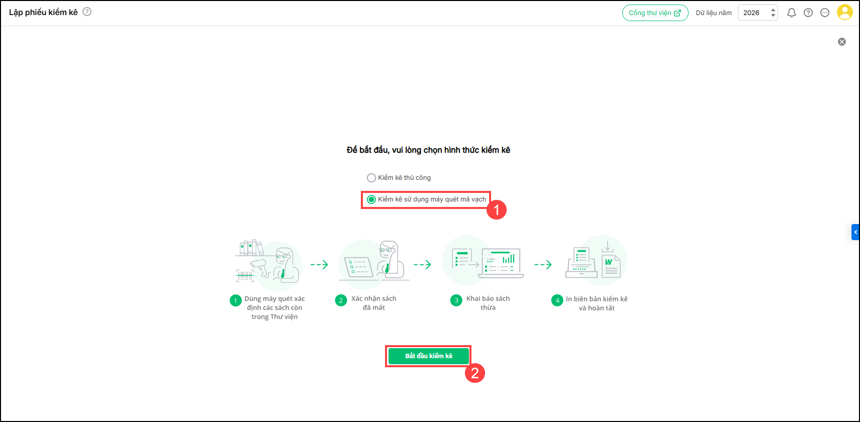 - Kiểm kê sử dụng máy quét mã vạch: Sử dụng máy quét mã vạch để kiểm kê toàn bộ sách trong thư viện.