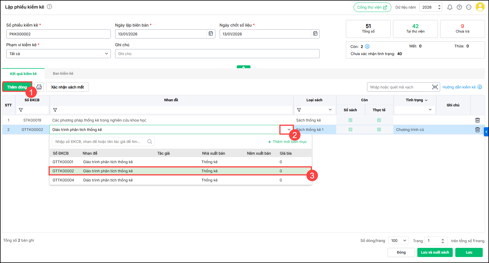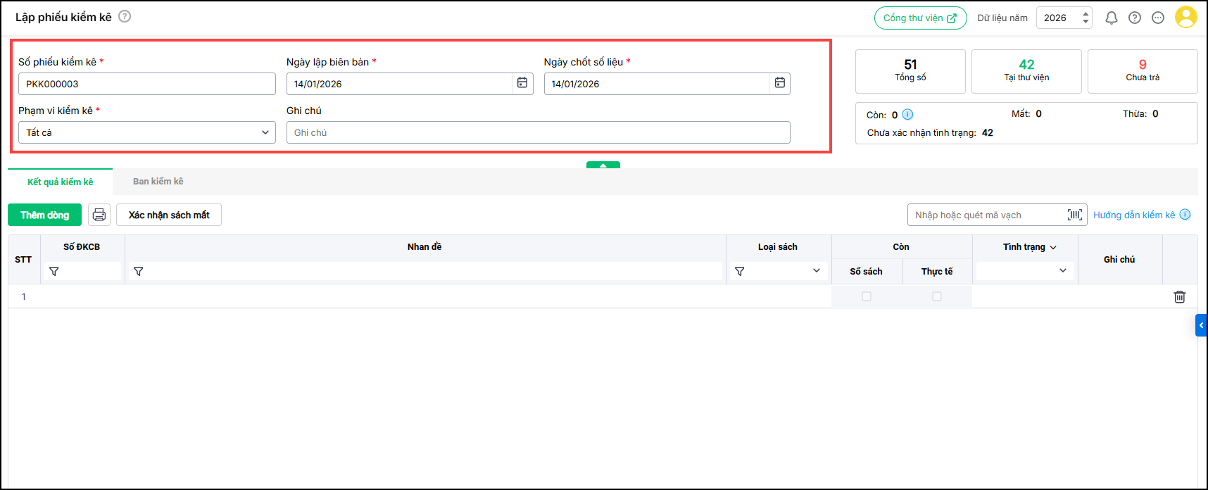 + Nhấn Thêm dòng để thêm dòng sách mới. Tìm kiếm và nhập biên mục sách cần kiểm kê.