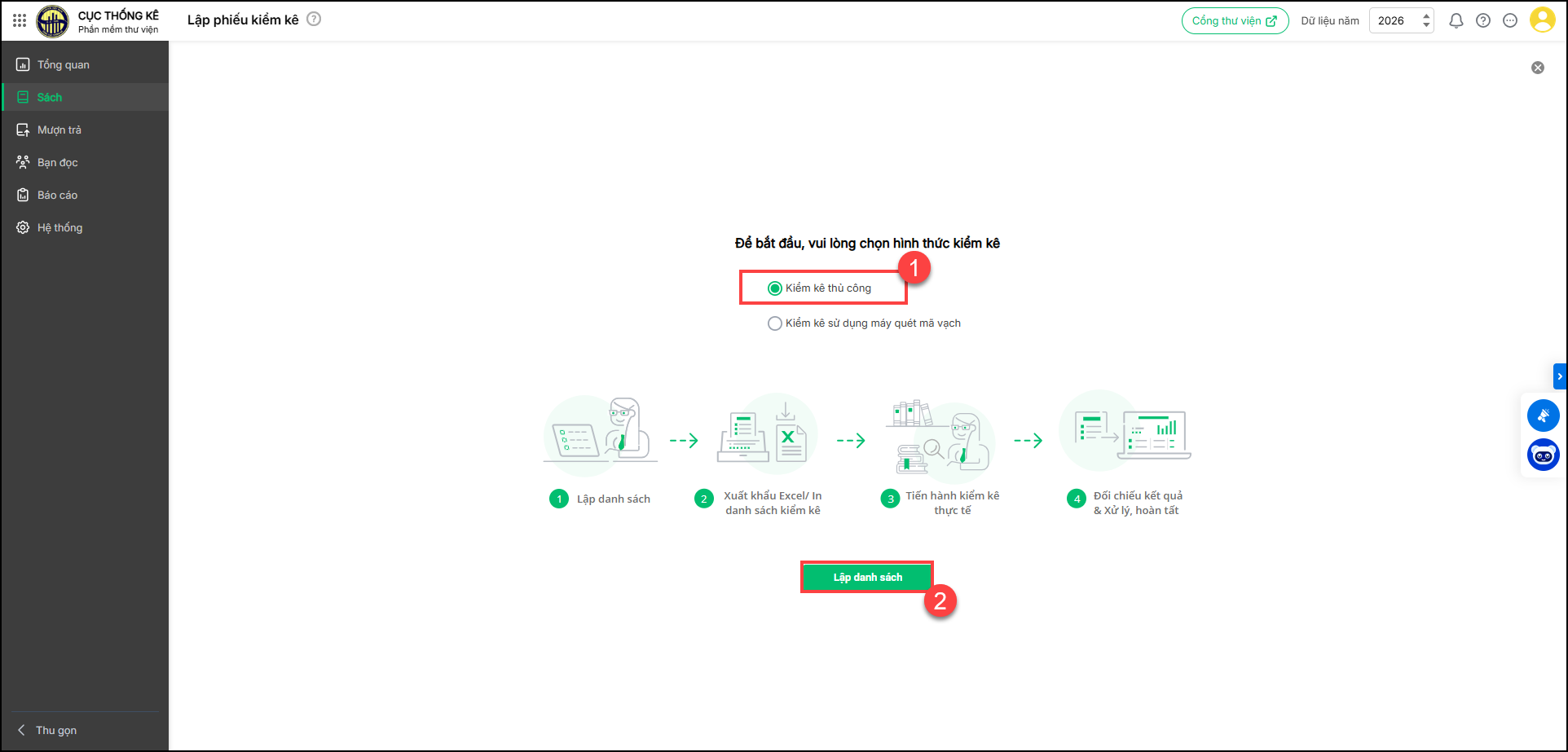 - Kiểm kê thủ công: Thực hiện khi cần kiểm kê ghi nhận bất thường hoặc kiểm kê toàn bộ sách bằng cách xuất khẩu toàn bộ danh sách để kiểm kê và nhập khẩu lại vào phần mềm.