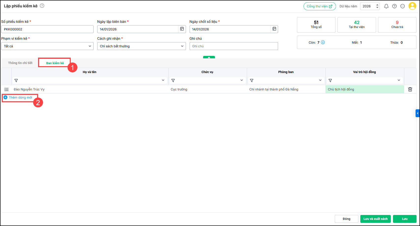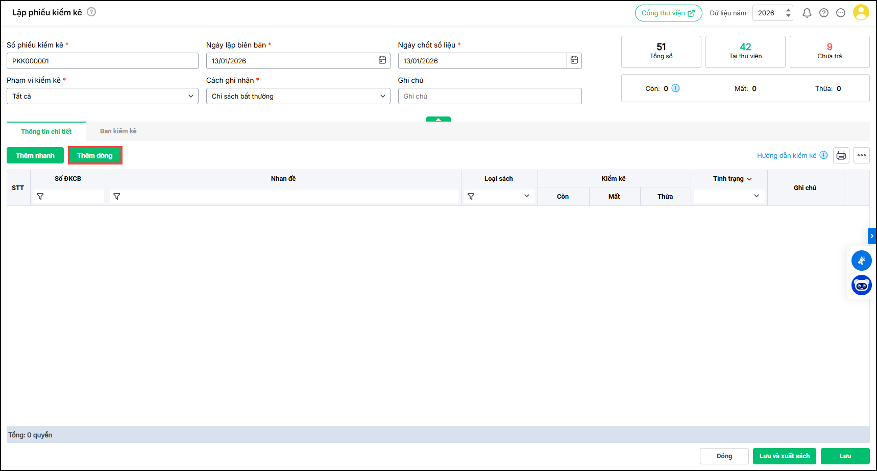 - Nhấn Thêm dòng mới để thêm sách vào danh sách kiểm kê
