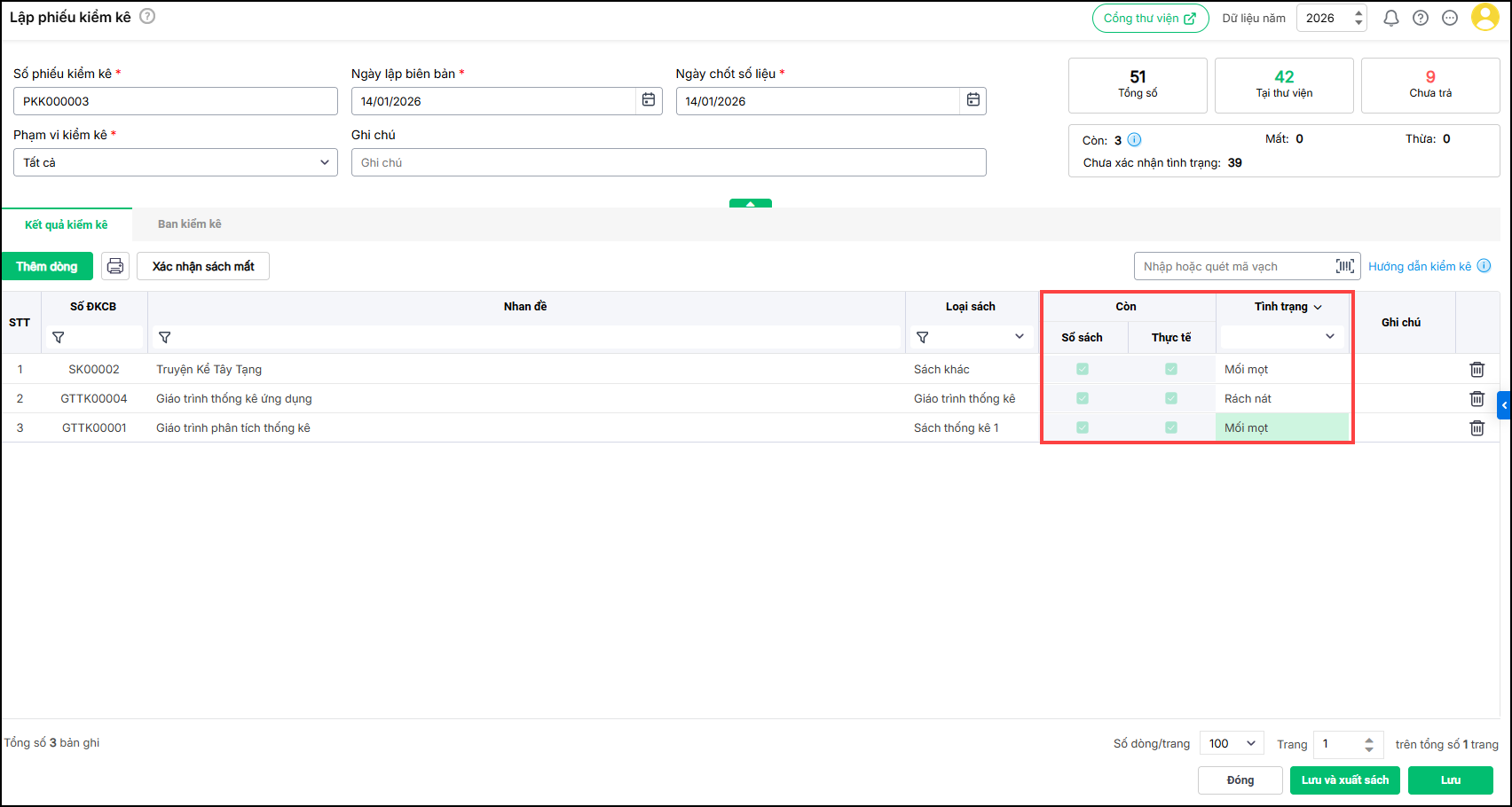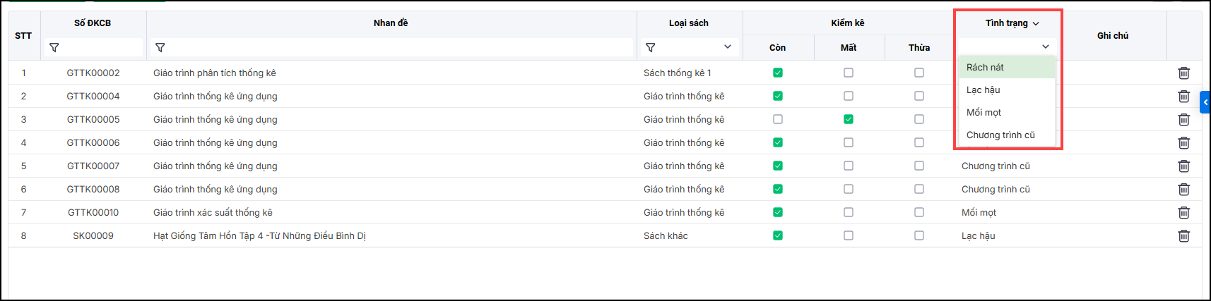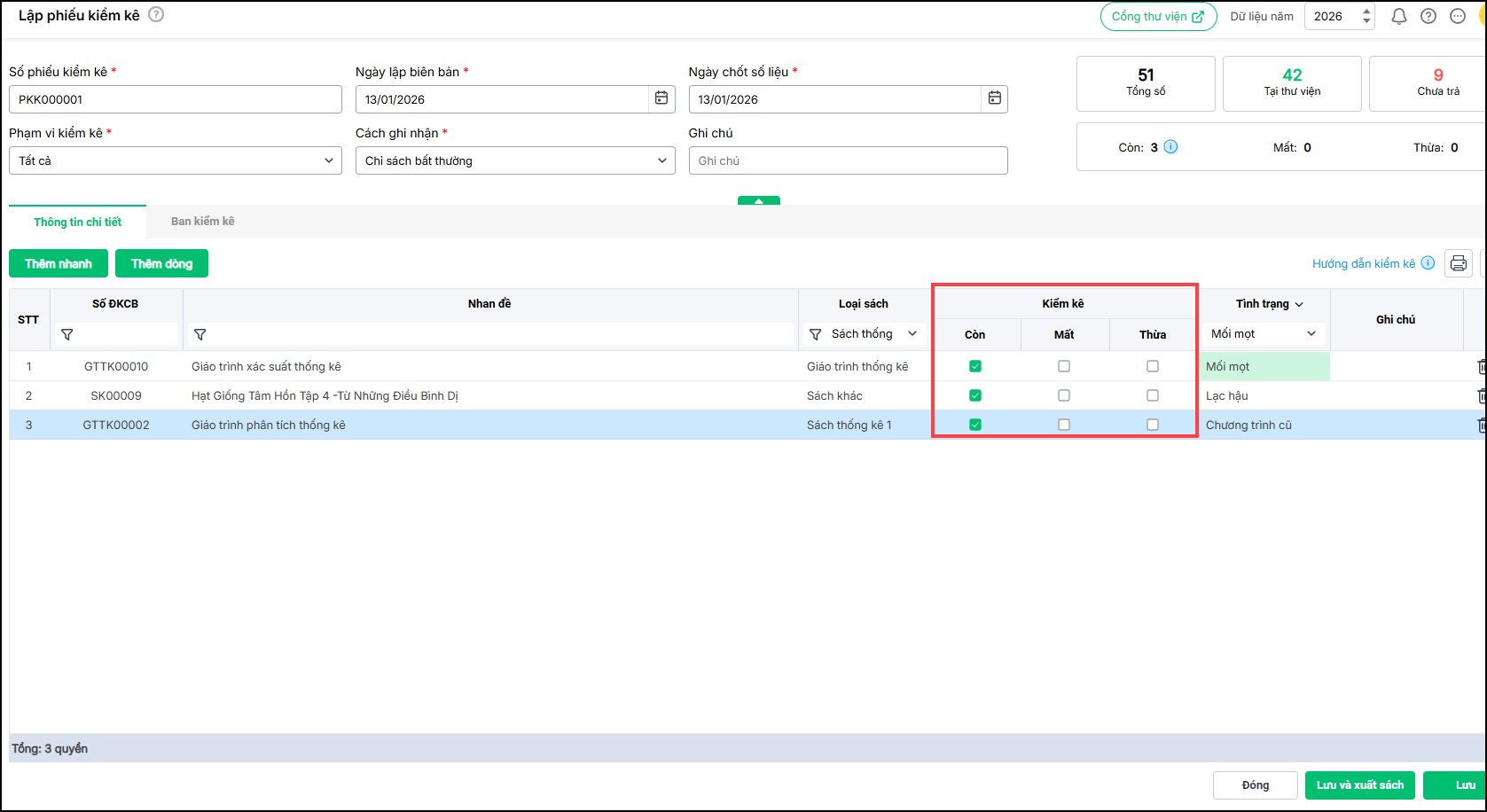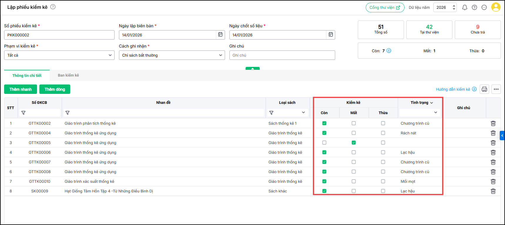 + Tích chọn tình trạng kiểm kê: Còn, Mất, Thừa tương ứng với từng sách