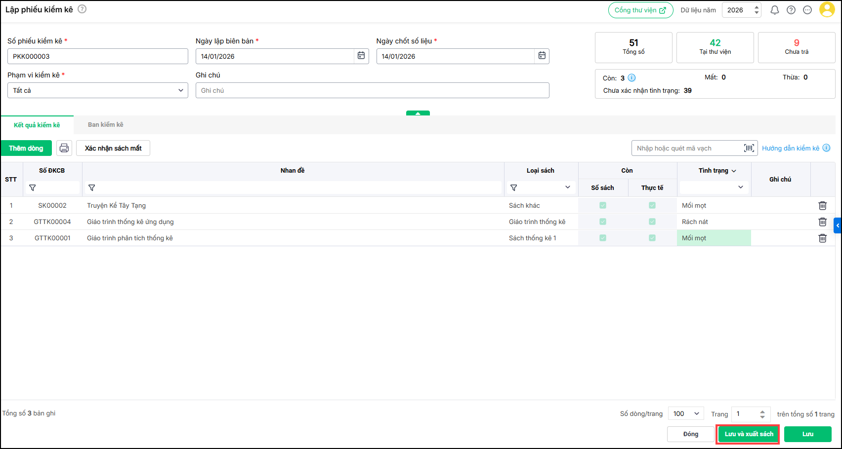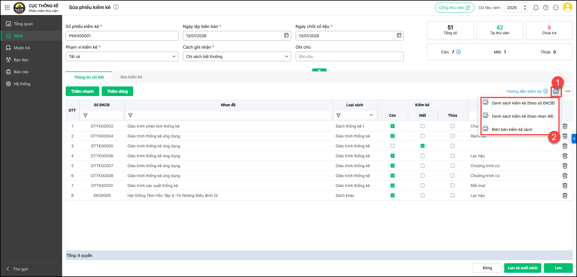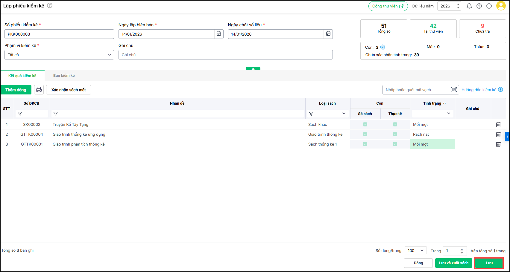 + Tích chọn tình trạng kiểm kê: Còn, Mất, Thừa tương ứng với từng sách