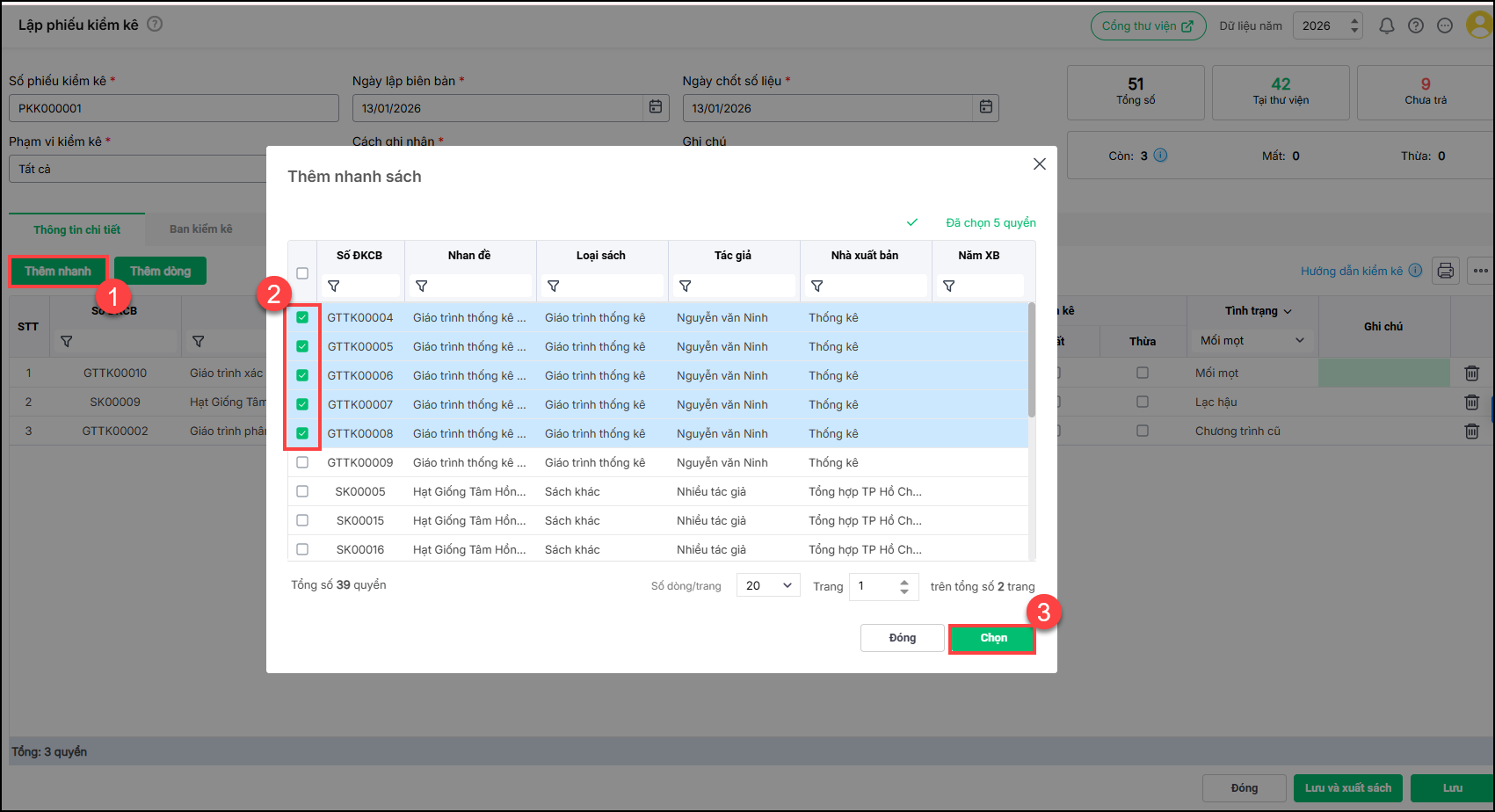 - Trường hợp chọn nhiều sách cùng lúc, nhấn Thêm nhanh. Tìm kiếm sách bằng cách lọc Loại sách hoặc SĐKCB, nhan đề. Tích chọn sách cần tìm. Nhấn Chọn.