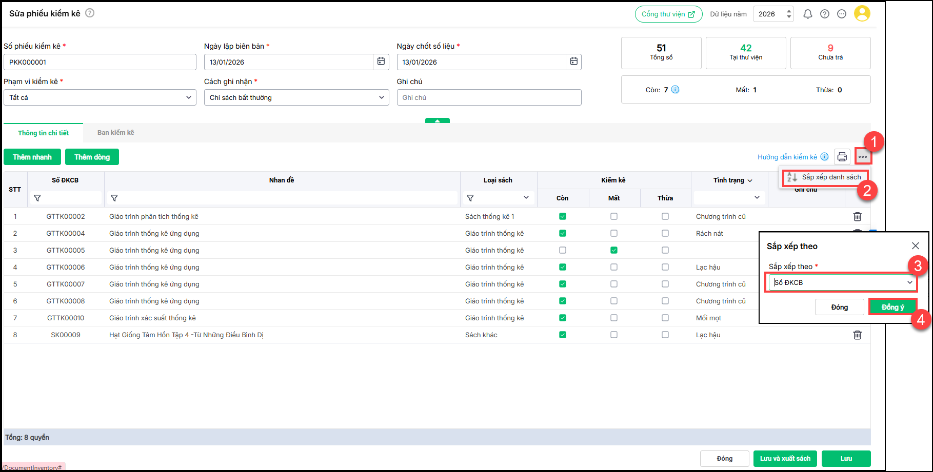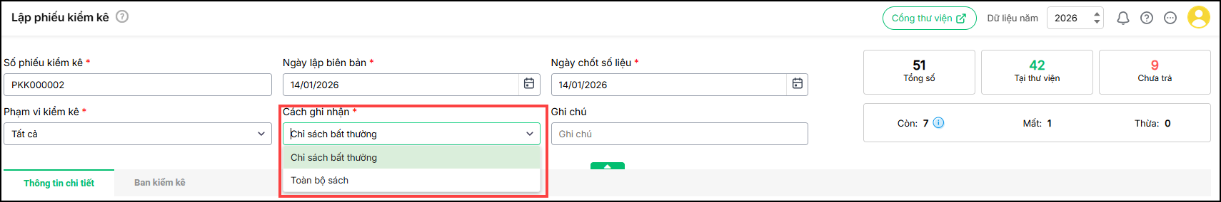 + Nếu sách thừa tức là sách chưa được khai báo tại thư viện nhưng kiểm kê lại có, cần khai báo bổ sung để thực hiện các nghiệp vụ mượn/trả sách liên quan.