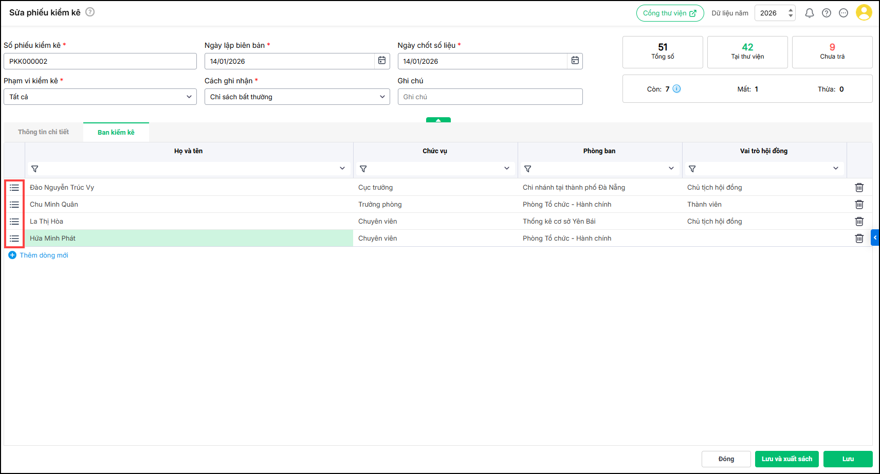 - Sử dụng các nút điều hướng để sắp xếp/xóa danh sách ban kiểm kê.