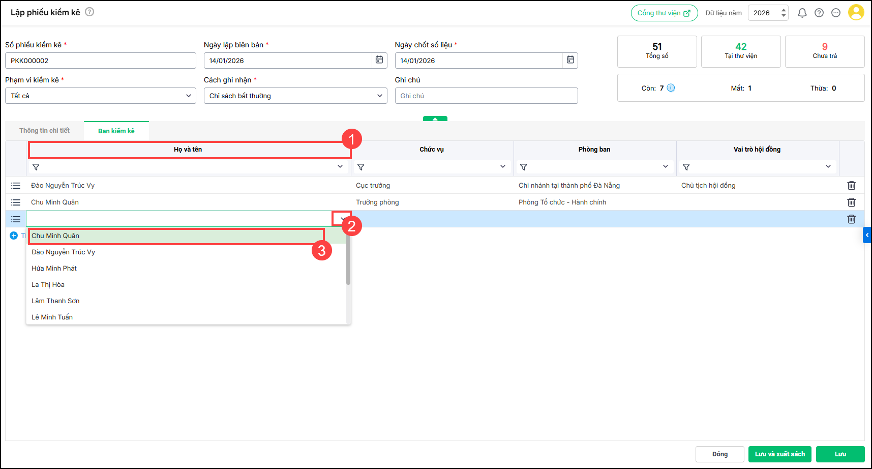 - Chọn thành viên ban kiểm kê từ danh sách cán bộ trường. Nhập thêm vai trò cho cán bộ kiểm kê (Nếu cần)