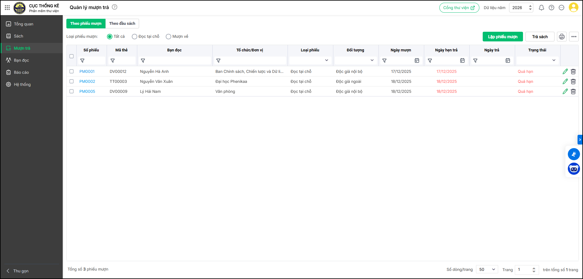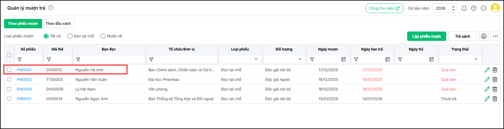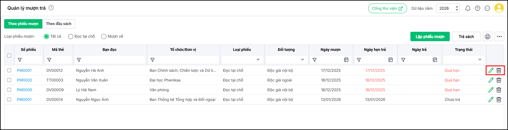 - Các phiếu mượn đã lập có thông tin chưa chính xác hoặc không muốn theo dõi có thể Chỉnh sửa/Xóa để quản lý theo đúng thực tế bằng cách nhấn vào biểu tượng Bút/Thùng rác tương ứng.