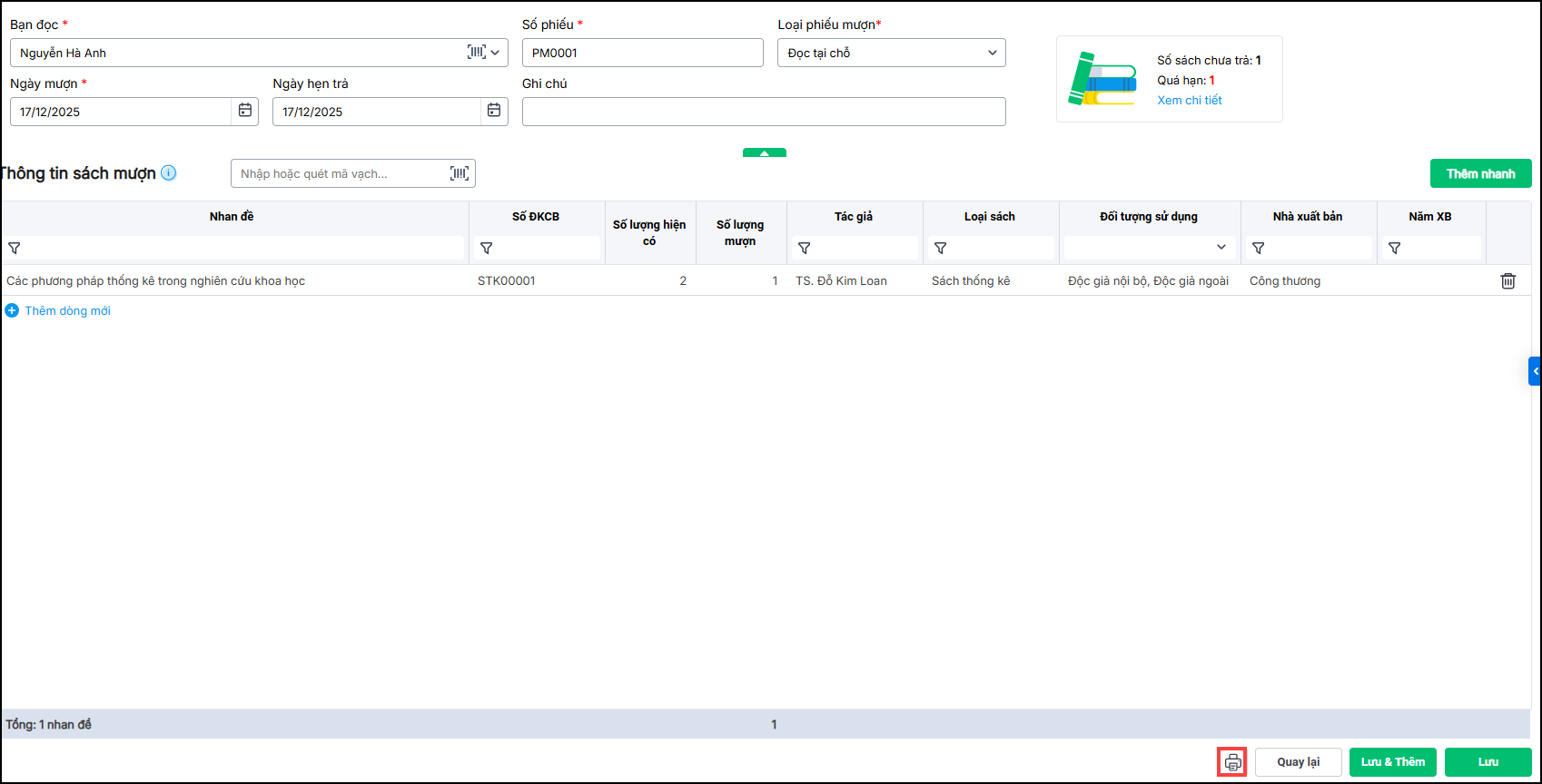 - Nhấn Lưu để lưu phiếu mượn; nhấn Lưu & Thêm để lưu và tiếp tục tạo phiếu mượn cho bạn đọc khác.
