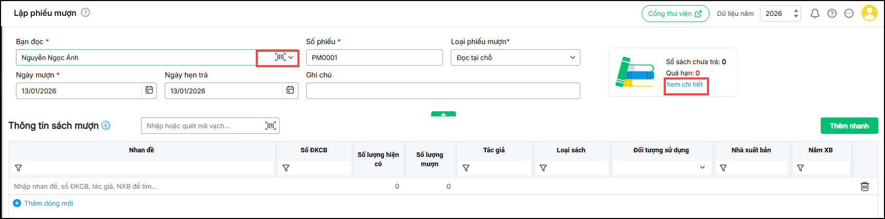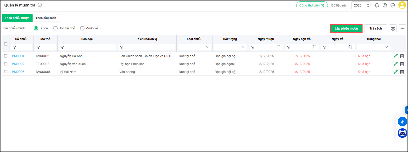 - Để thêm phiếu mượn mới, chọn Lập phiếu mượn.