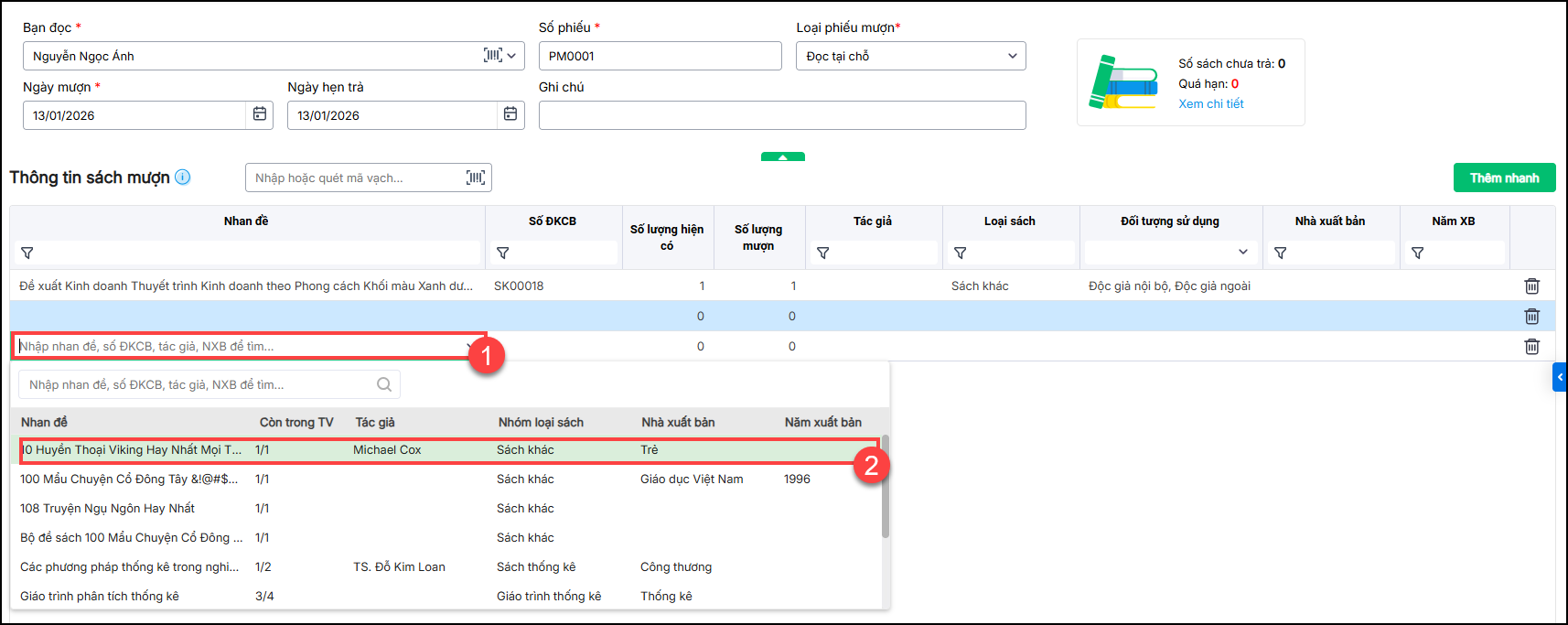 - Nhấn Thêm dòng mới để mượn thêm sách. Ngoài ra, cán bộ thư viện có thể Thêm nhanh danh sách nhiều sách cần mượn cùng lúc. Tích chọn đầu sách nhập số lượng mượn với từng nhan đề sách tương ứng.