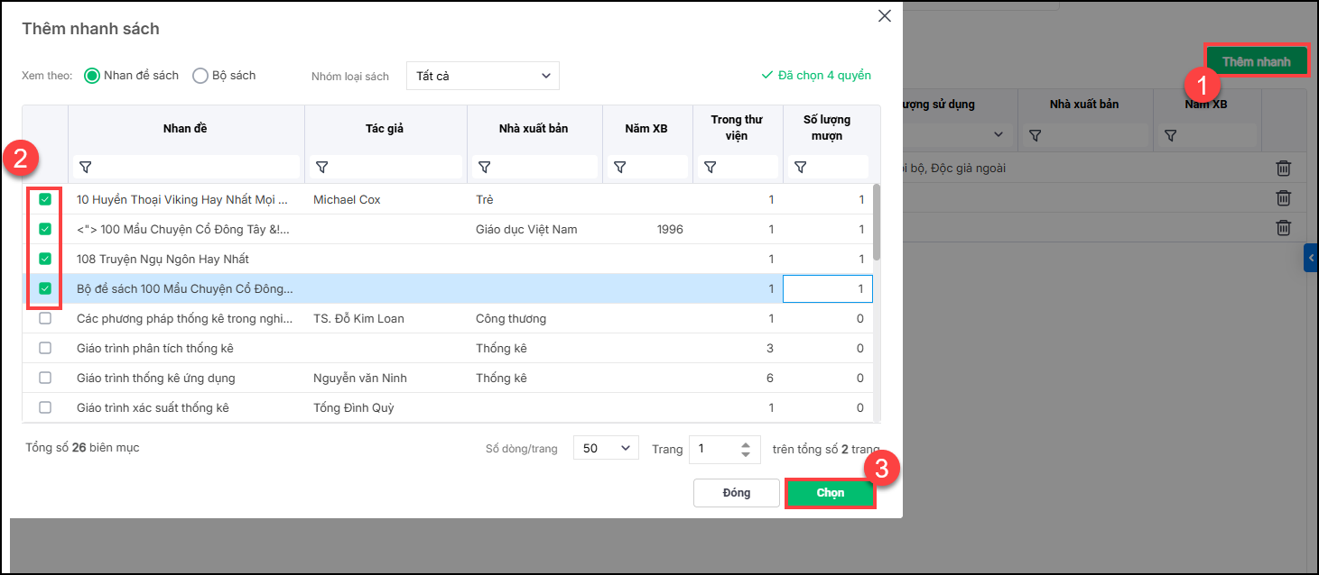 - Nhấn Chọn để thêm các sách đã chọn vào phiếu mượn.