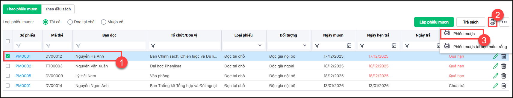 Cách 1: In tại màn hình Quản lý danh sách mượn trả