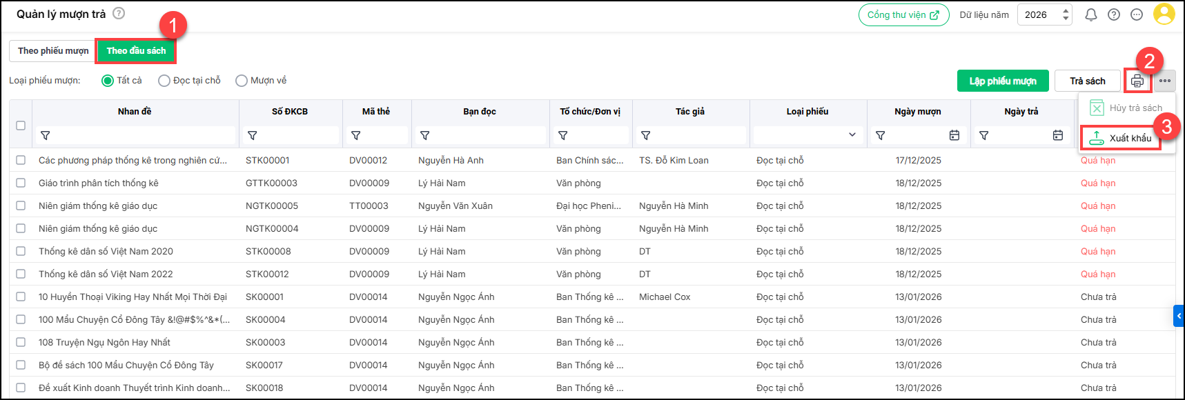 - Cán bộ thư viện có thể xuất khẩu danh sách mượn sách để thống kê và tổng hợp số liệu theo nhiều tiêu chí bằng cách chọn Xem theo đầu sách, vào Tiện ích\Xuất khẩu.