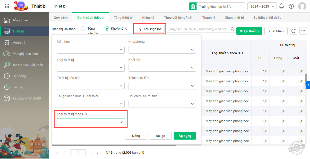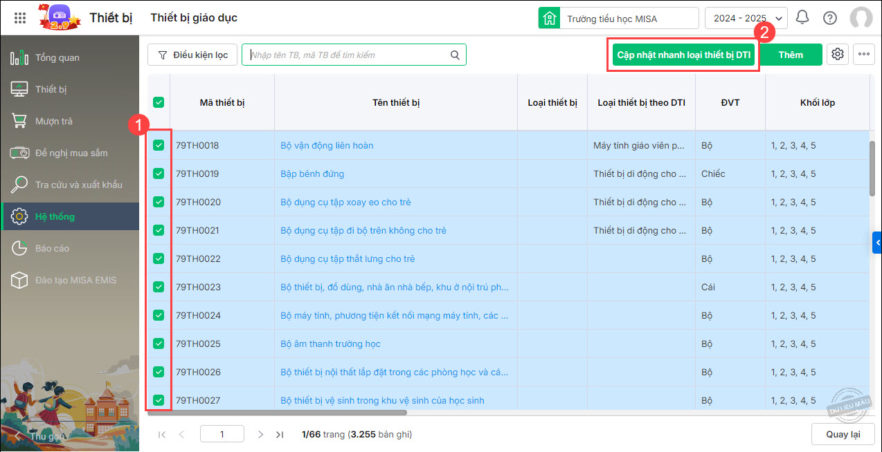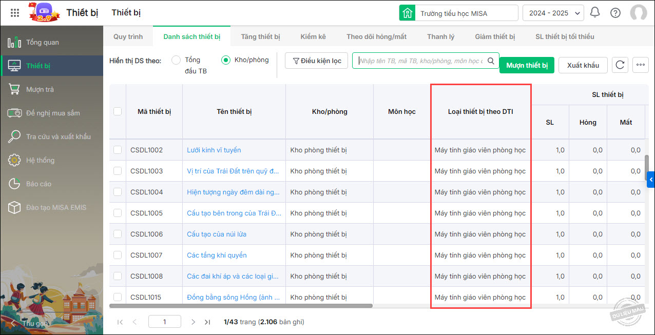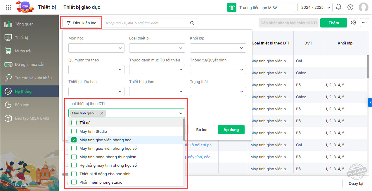 Tại màn hình Hệ thống\Thiết bị giáo dục, phần mềm đã đáp ứng cho người dùng phân loại từng thiết bị vào đúng loại thiết bị theo DTI. Tuy nhiên, nhà trường có số lượng thiết bị lớn, việc phân loại từng thiết bị mất nhiều thời gian thực hiện.