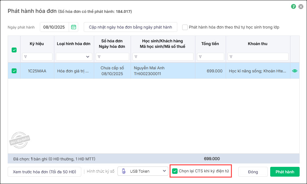 – Tại màn hình Quản lý thu\Hóa đơn, khi chọn phát hành hóa đơn, tích chọn Chọn lại CTS khi ký điện tử.