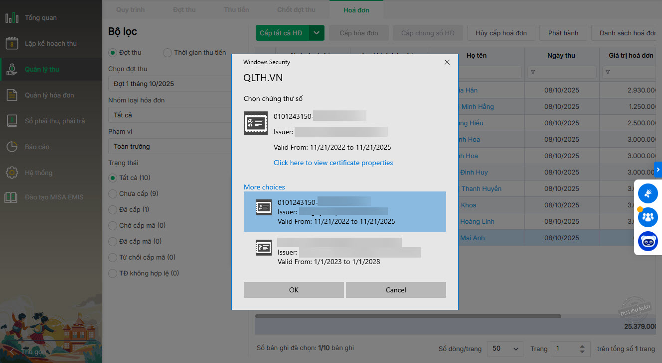 5. [EMIS Khoản thu] Khi phát hành hóa đơn chọn sai chứng thư số thì lần sau phát hành được chọn lại chứng thư số đúng