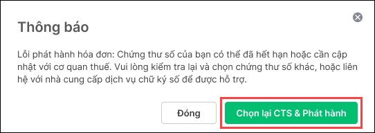 – Trường hợp phần mềm báo phát hành lỗi do CTS, nhấn Chọn lại CTS và phát hành để chọn lại CTS hợp lệ và phát hành.