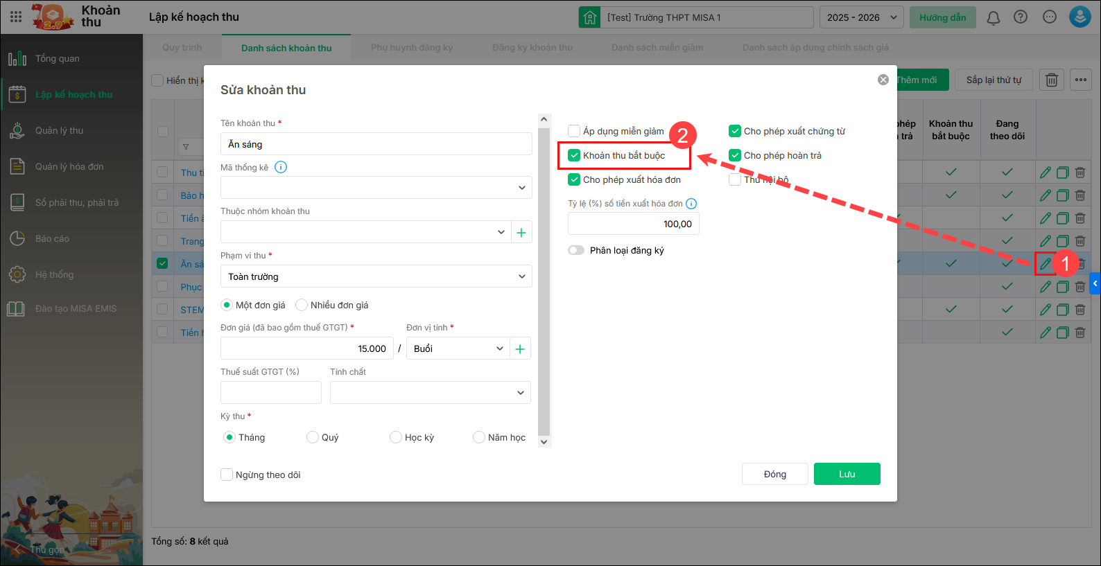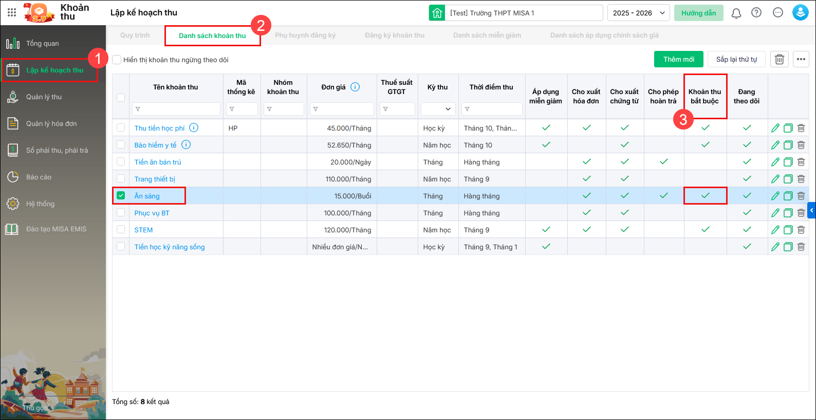 Bước 1: Vào Lập kế hoạch thu\Danh sách khoản thu. Kiểm tra khoản thu cần đăng ký cho học sinh có dấu tích V tại cột Khoản thu bắt buộc.