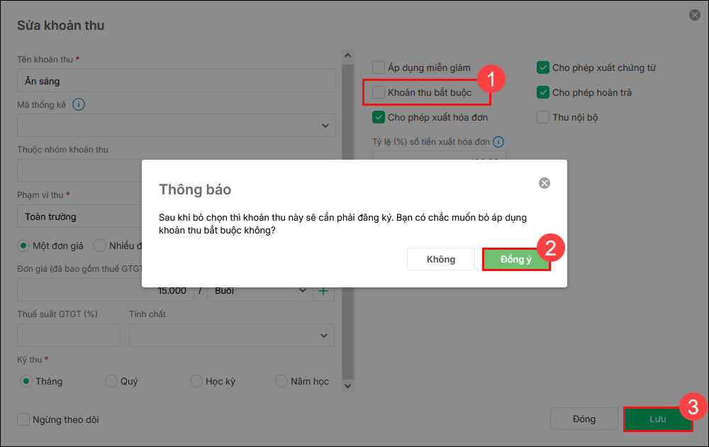 Bước 3: Sau khi bỏ tích ô Khoản thu bắt buộc, phần mềm hiển thị thông báo để xác nhận. Nhấn Đồng ý, nhấn Lưu để cập nhật.