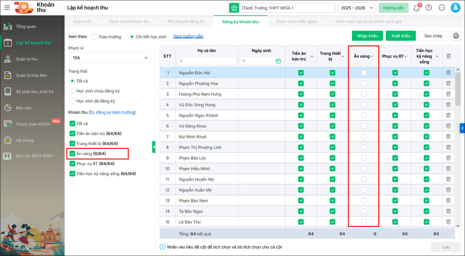 Bước 4: Chỉnh sửa khoản thu xong, vào mục Lập kế hoạch thu\Đăng ký khoản thu để đăng ký cho học sinh.