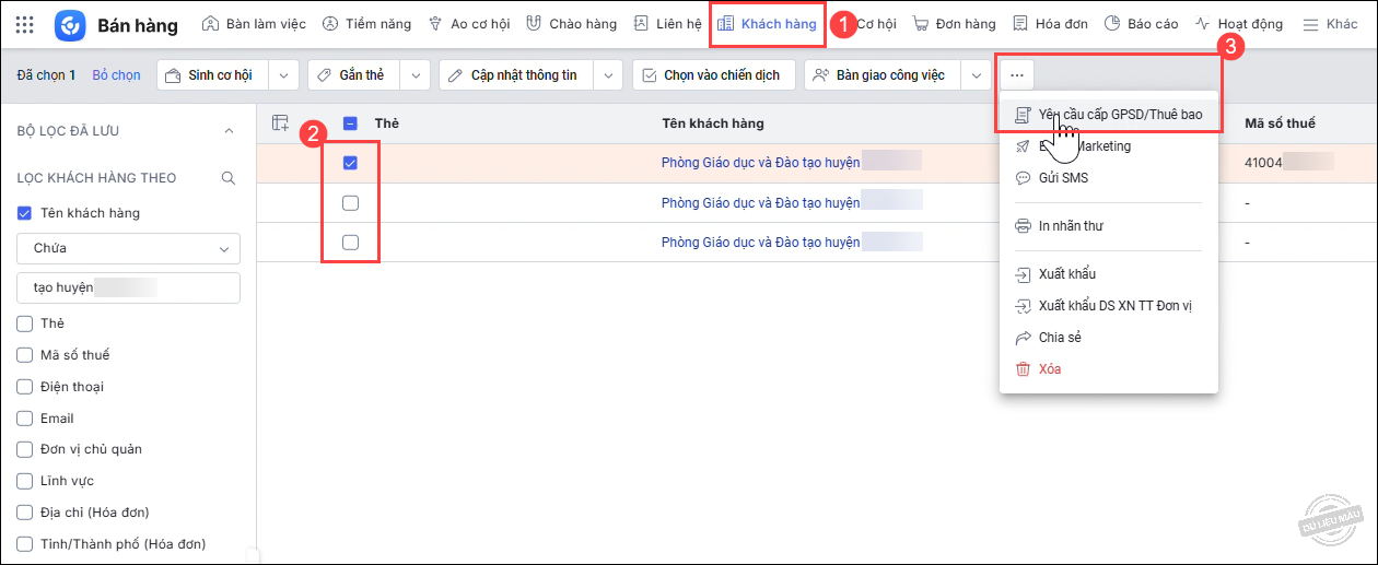 1. Trên Amis Bán hàng, vào tab Khách hàng, chọn đơn vị cầnchuyển đổi thông tin tỉnh/thành phố, nhấn vào biểu tượng ⋯ chọn Yêu cầu cấp GPSD/Thuê bao.