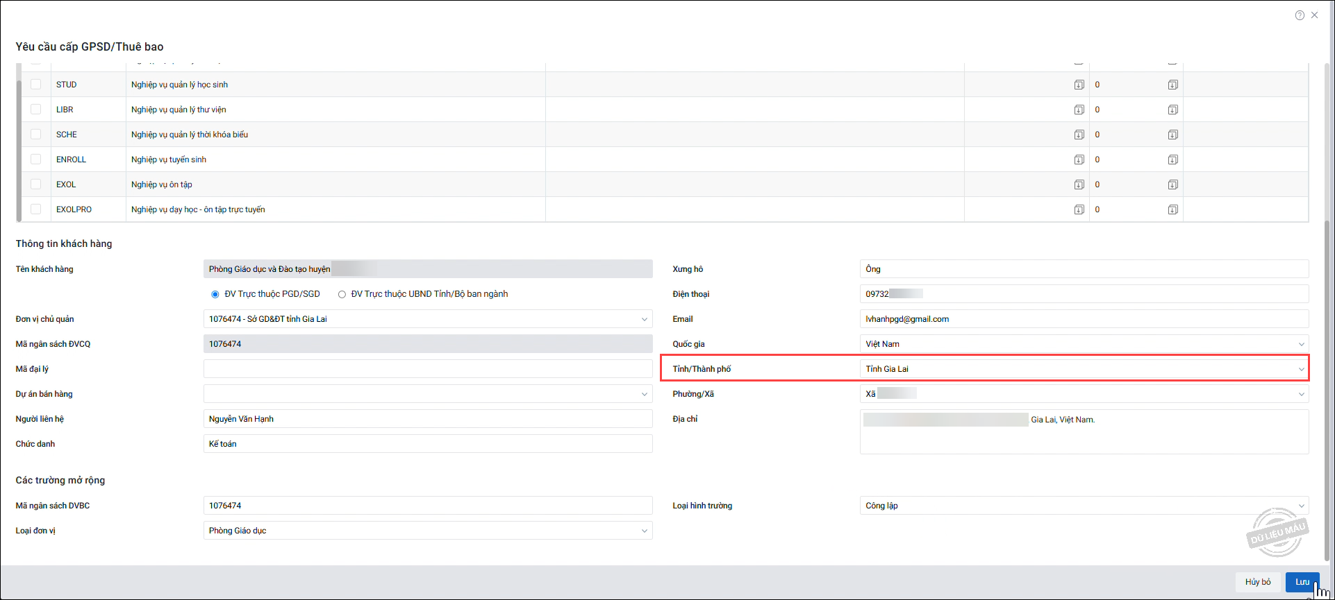 - Thông tin tỉnh/thành phố là tỉnh/thành phố đã điền khi yêu cầu cấp tài nguyên.