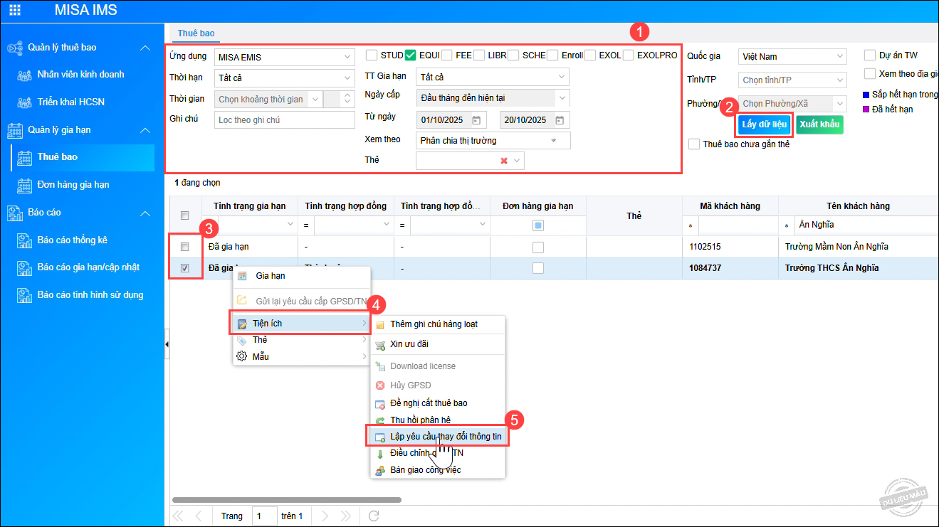 - Trên MISA IMS, vào Thuê bao, lọc các thông tin sản phẩm. Nhấn Lấy dữ liệu.