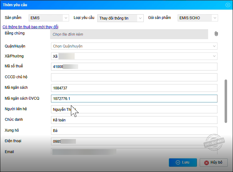 - Mã ngân sách ĐVCQ: Đối với khối mầm non, tiểu học, THCS, điền mã ngân sách Phòng Giáo dục tương ứng; đối với khối THPT, điền mã ngân sách của Sở Giáo dục.