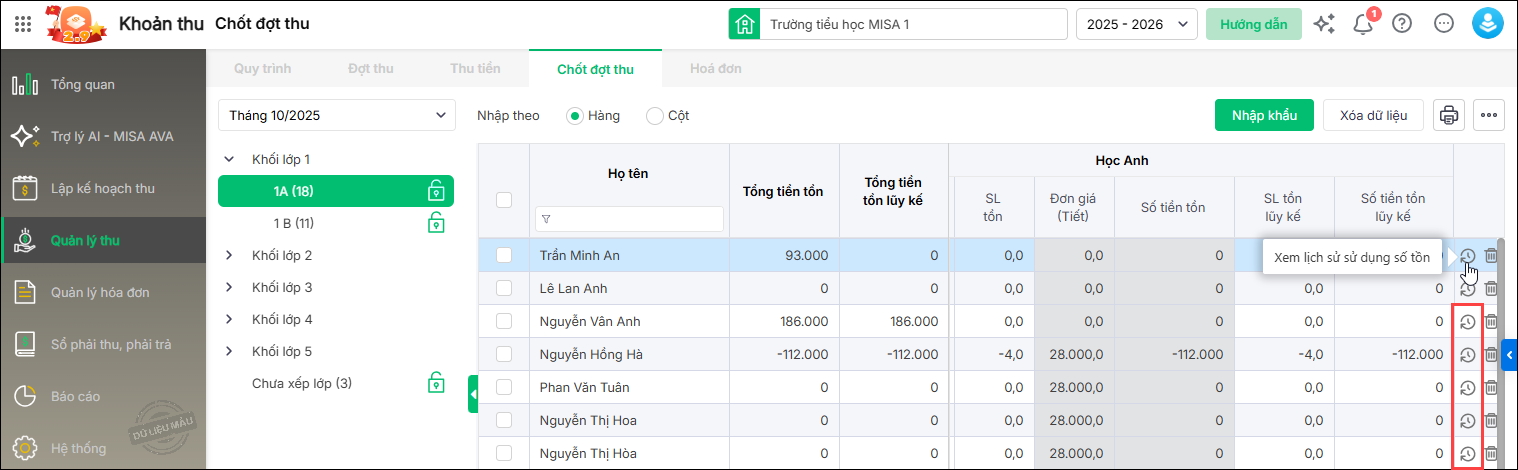 Với những học sinh có tình trạng sử dụng số tòn phức tạp, kế toán có thể tra cứu lịch sử sử dụng để xác minh nguồn gốc số tiền.