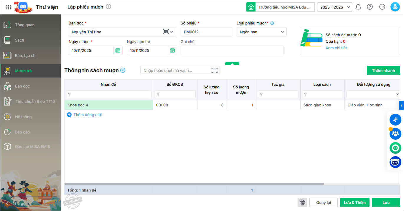 Ví dụ: Chọn chức năng Mượn sách, MISA AVA sẽ tự động mở màn hình Mượn trả\Lập phiếu mượn.