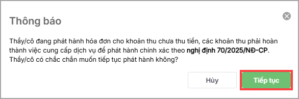 2. Hệ thống hiển thị thông báo để người dùng xác nhận lại các khoản thu đã hoàn thành cung cấp dịch vụ để phát hành hóa đơn chính xác, bấm Tiếp tục