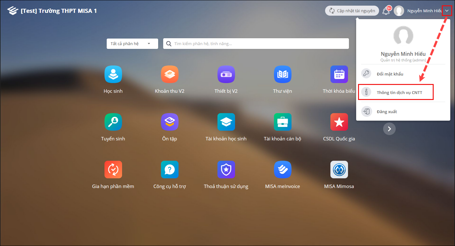 Bước 1: Đăng nhập vào phần mềm EMIS, nhấn vào mũi tên bên cạnh tên tài khoản người dùng, chọn Thông tin dịch vụ CNTT.