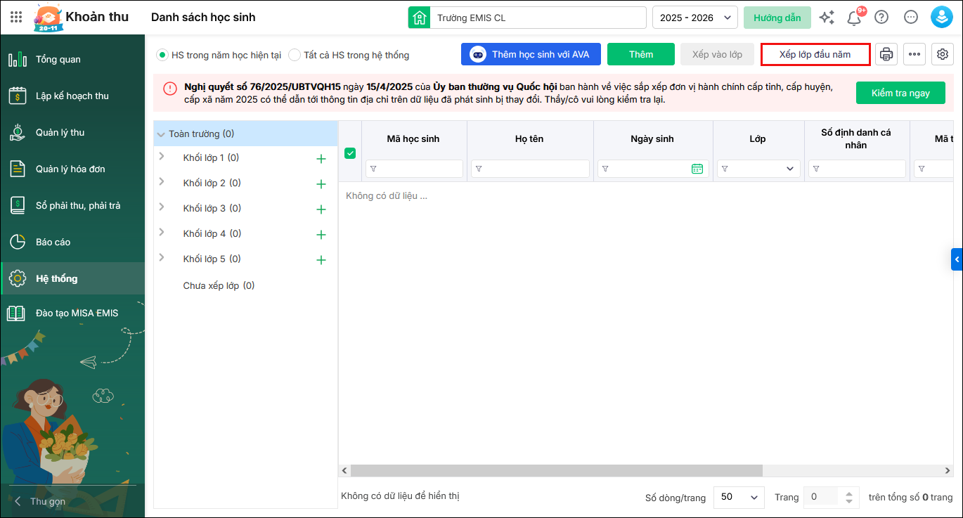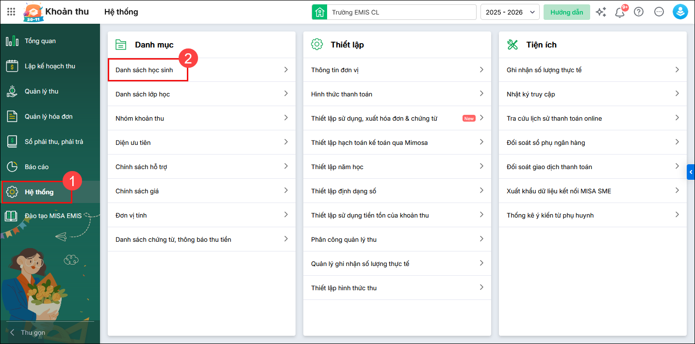 Bước 2: Vào Hệ thống\Danh sách học sinh.