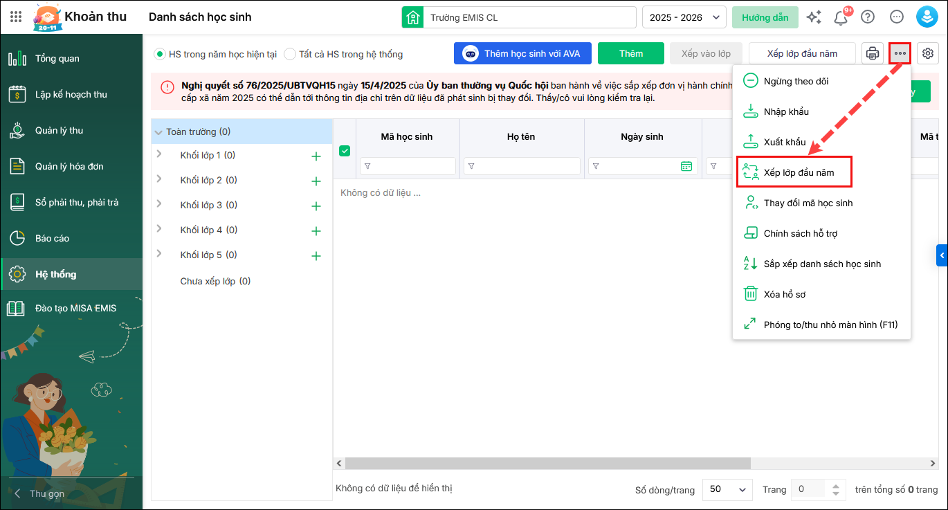 Hoặc, nhấn vào dấu 3 chấm, chọn Xếp lớp đầu năm.